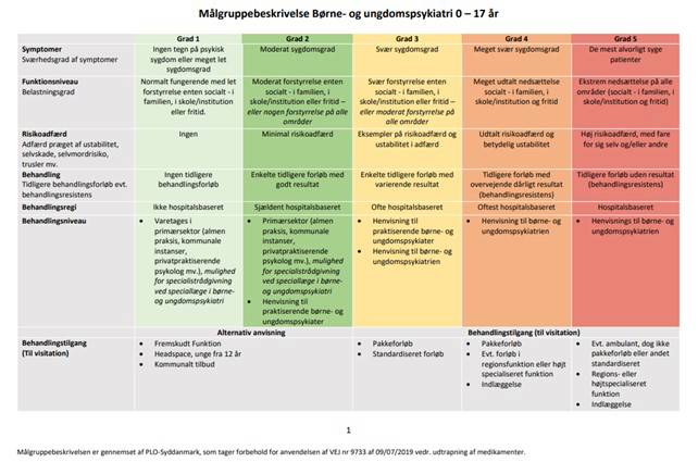 For de fleste diagnoser gælder, at symptomerne skal være til stede i svær grad, og at der skal være afprøvet forskellige indsatser i kommunen, før barnet eller den unge er i målgruppen for behandling i børne- og ungdomspsykiatrien. Hvis det ikke er tilfældet, vil en henvisning ofte blive sendt retur til kommunen med besked om at iværksætte relevante tiltag. I praksis betyder det, at vi (forældre, skole/dagtilbud, familieafdeling mf.) skal arbejde systematisk over tid med tiltag, før en henvisning til psykiatrien kan komme på tale.